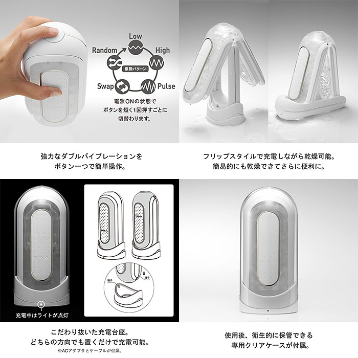 振動は5パターン(弱振動→強振動→リズム振動→交互に振動→ランダム)。充電は置くだけ充電を採用しているので、洗い終わったらそのまま台座へ置くだけでOK。いつでもパワフルな電動TENGAをお使いいただけます。 アダルト業界の革命的存在とも言われるTENGA.。今後のTENGAからも目が離せません。